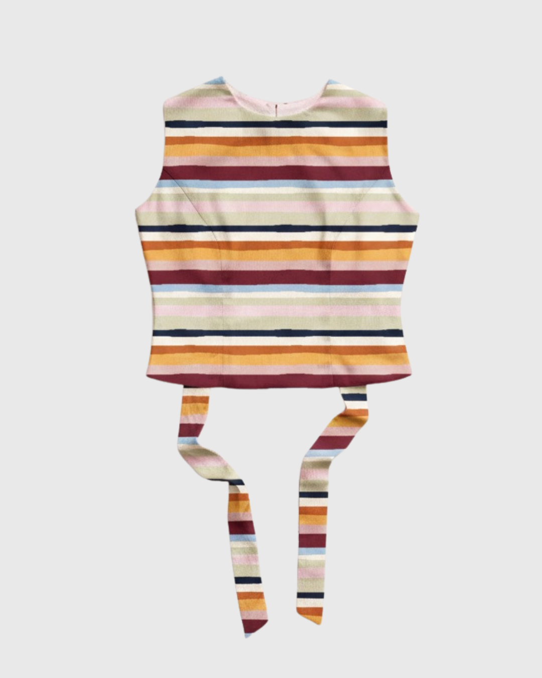 Top con escote cerrado y estructura recta. La espalda presenta una abertura amplia y un amarre...