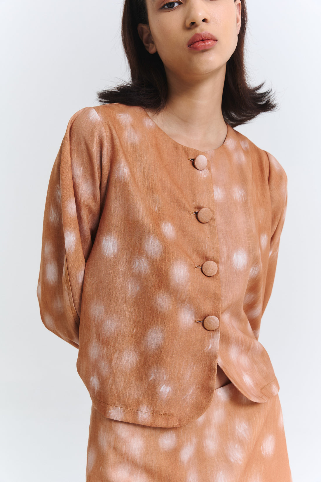 Camisa de cuello y cierre frontal de botones ocultos.Tiene cinta en la espalda para ajustar...