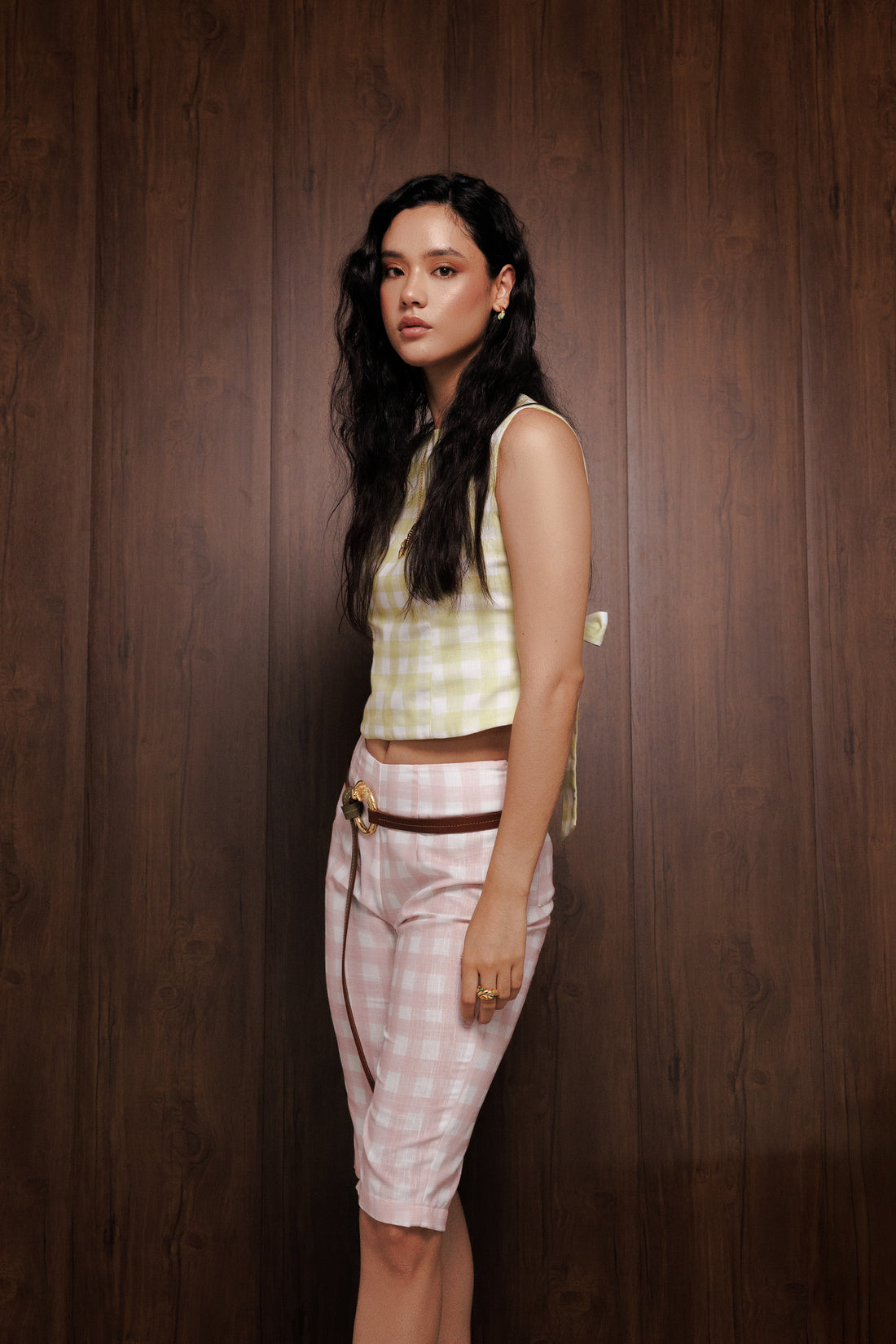 Pantalón capri en lino con estampado vichy en tono rosa pastel. Presenta largo a la...