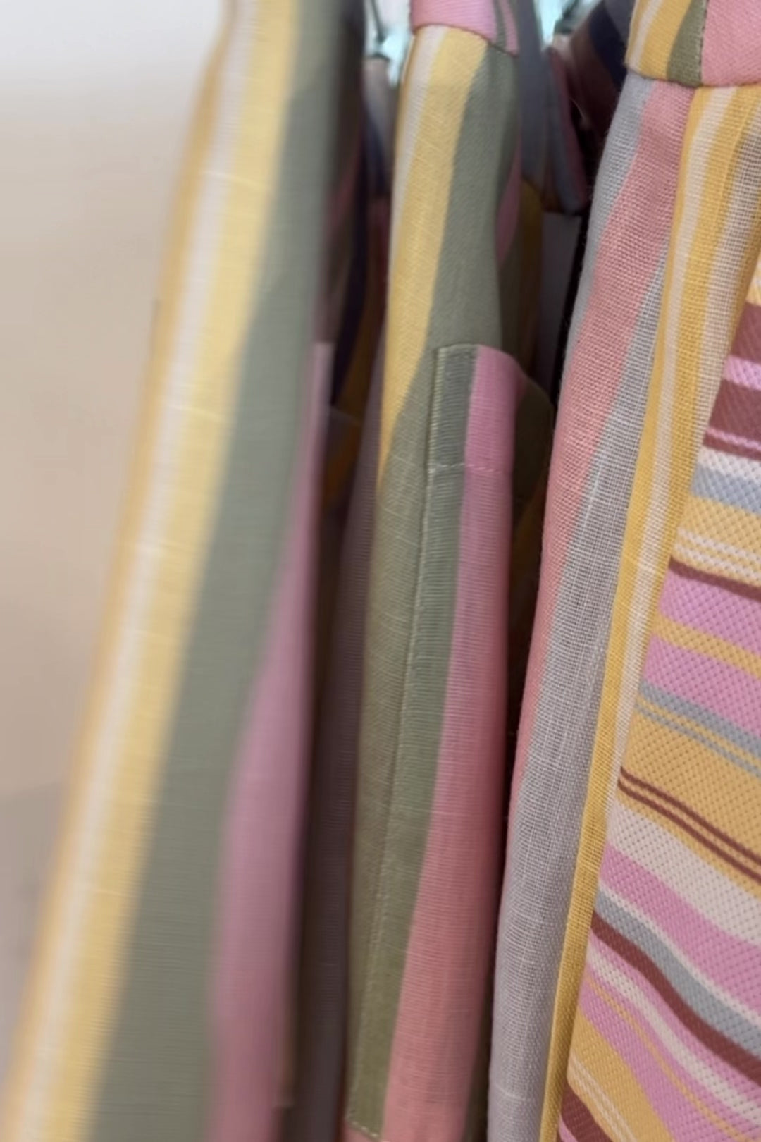 Pantalón en lino con estampado de rayas multicolor en tonos pastel. De silueta recta y talle medio, ofrece un fit relajado y versátil para el día a día. Diseñado y confeccionado en Colombia.