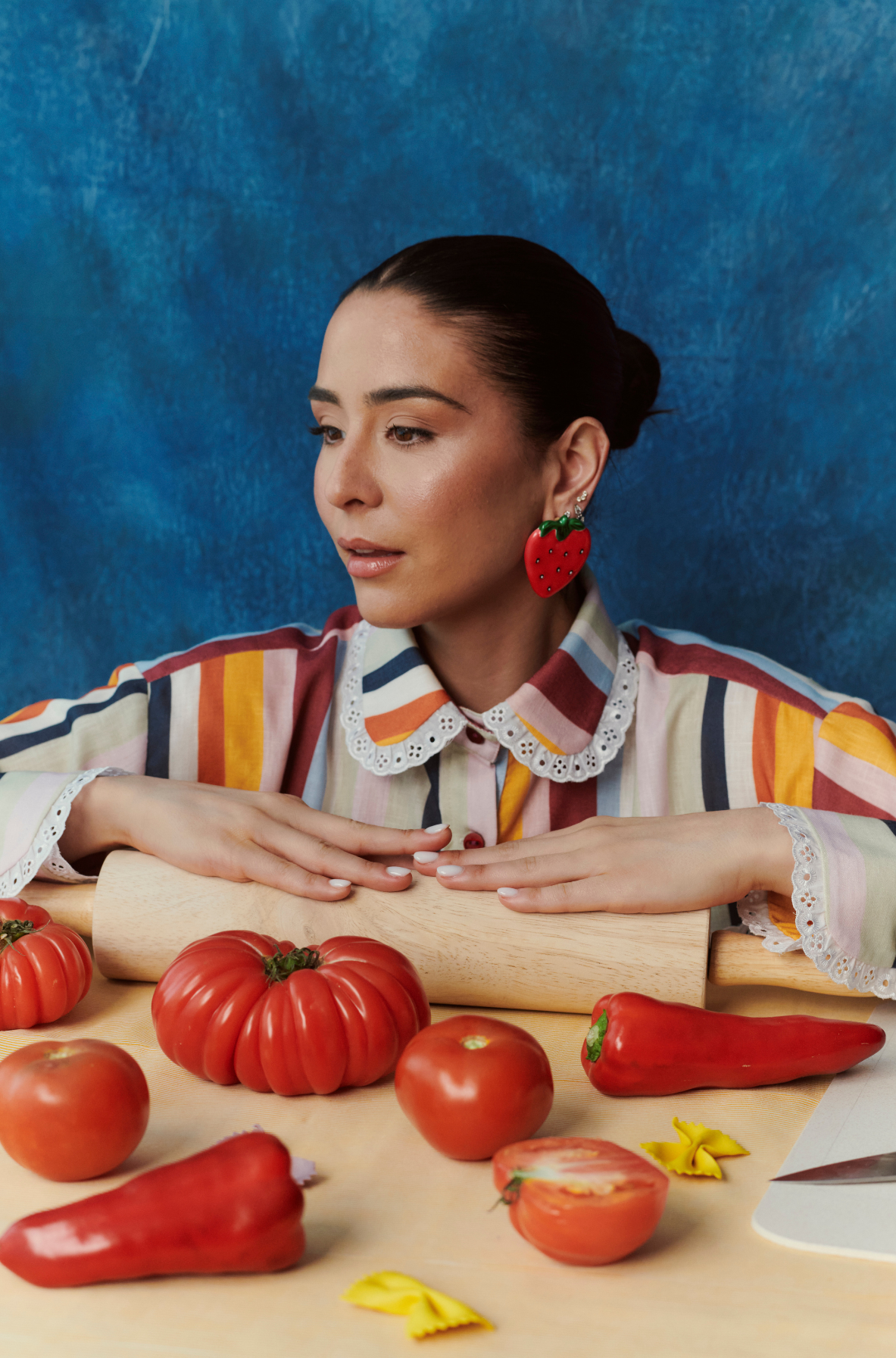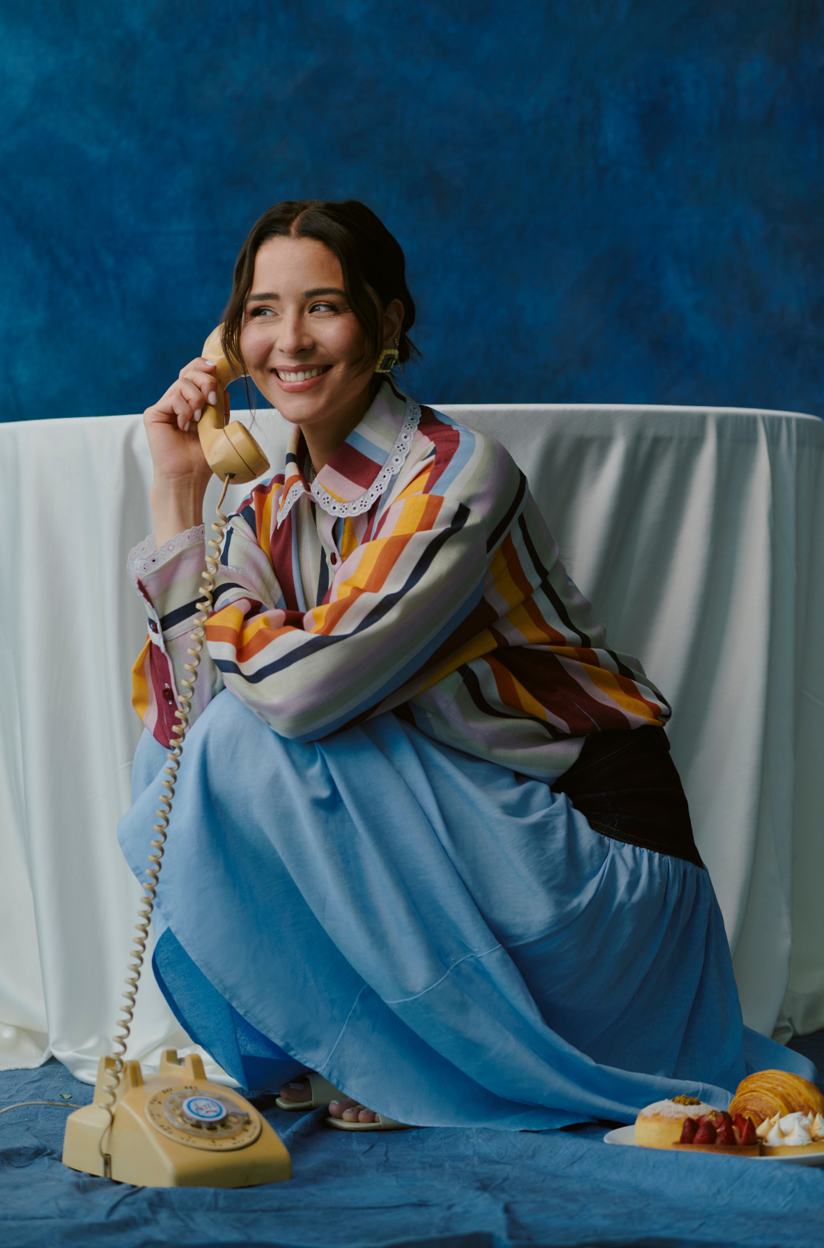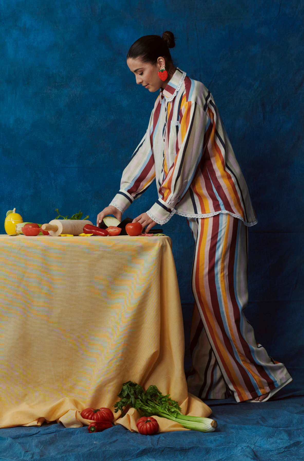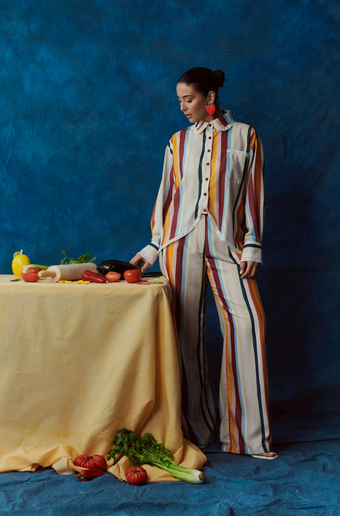 Camisa de fit oversize con cuello camisero y bolsillo frontal. Presenta un ruedo curvado con cruce al centro y ribetes decorativos en cuello, puños y borde inferior. Diseñada y confeccionada en Colombia. Colaboración con María Riba (2025).