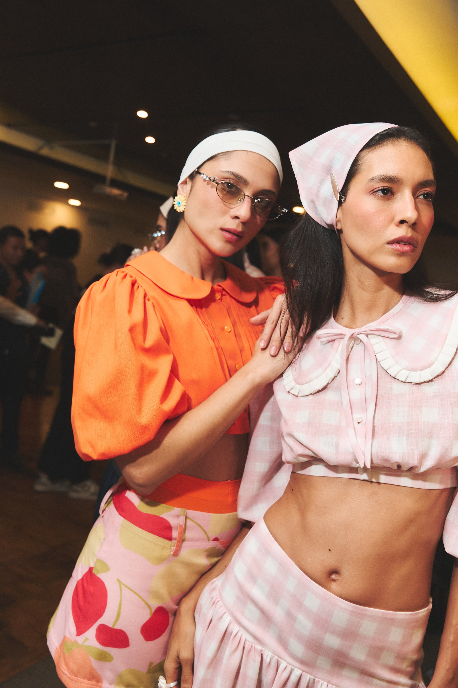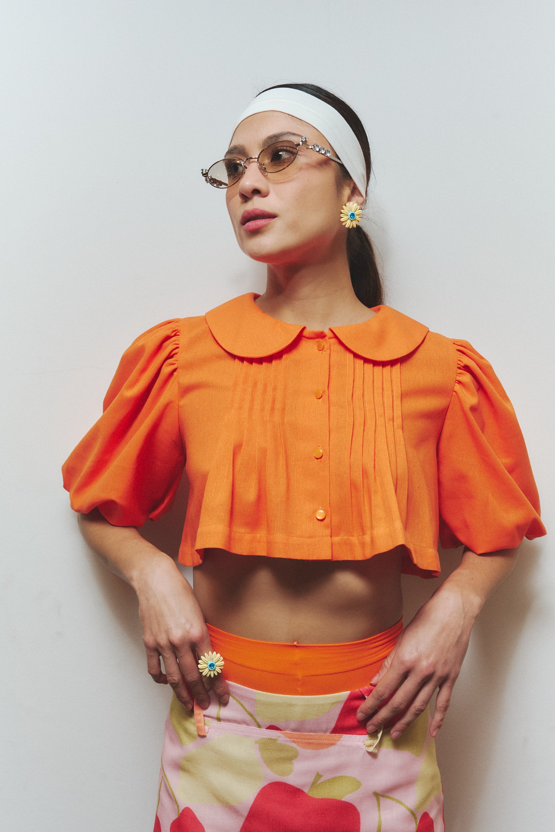 Top corto en lino color naranja vibrante. Tiene cuello redondo con solapa oversized, detalles de alforzas en el frente y mangas abombadas. Diseñado y confeccionado en Colombia.