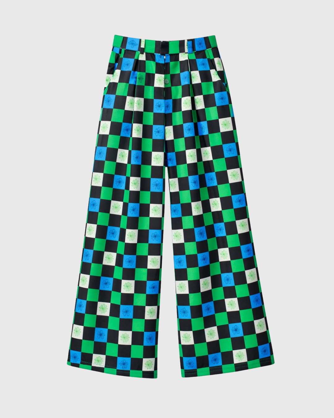 Pantalón estampado de tiro alto con prenses, botones ocultos y bota recta. Diseñado y confeccionado en Colombia.