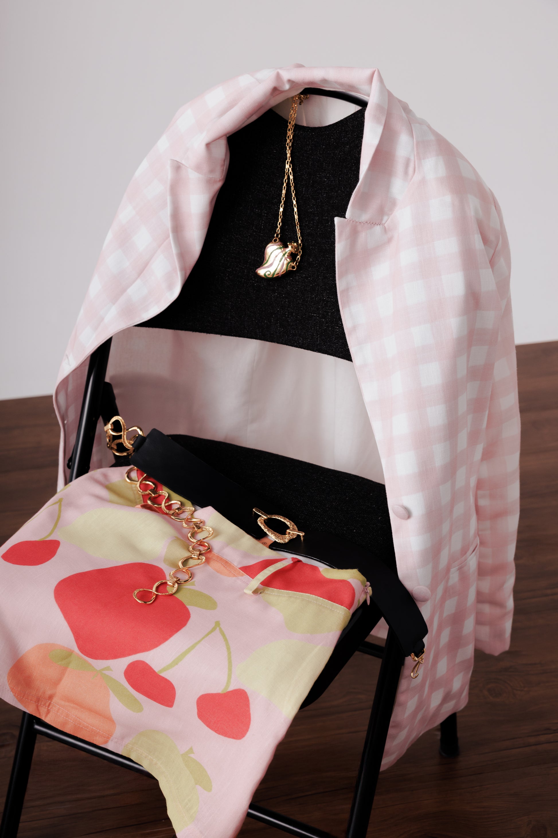 Mini falda en lino con estampado de frutas en tonos rojos y naranjas sobre fondo rosa pastel. Silueta recta con pretina ancha. Diseñada y confeccionada en Colombia.