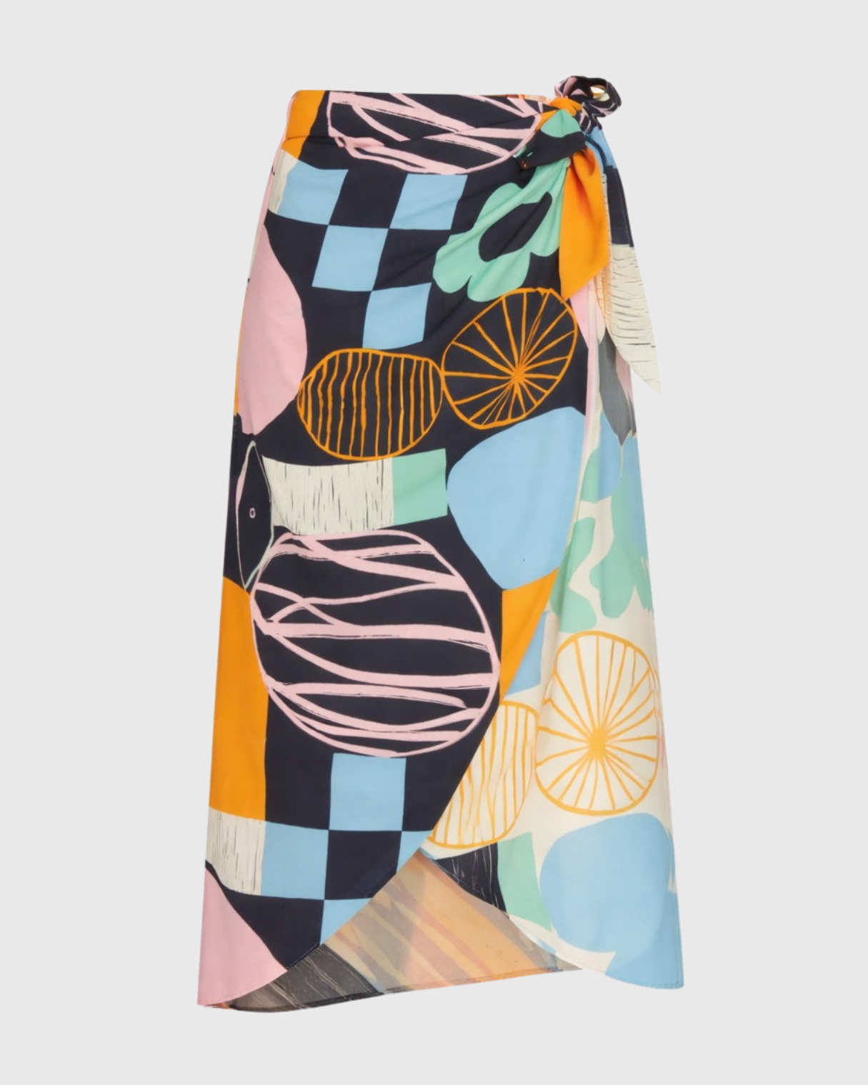 Falda estampada midi de amarrar en un costado. Diseñada y confeccionada en Colombia. Esta pieza hace parte de una colaboración especial con la ilustradora y creativa Laura y las flores. Disponible bajo pedido.