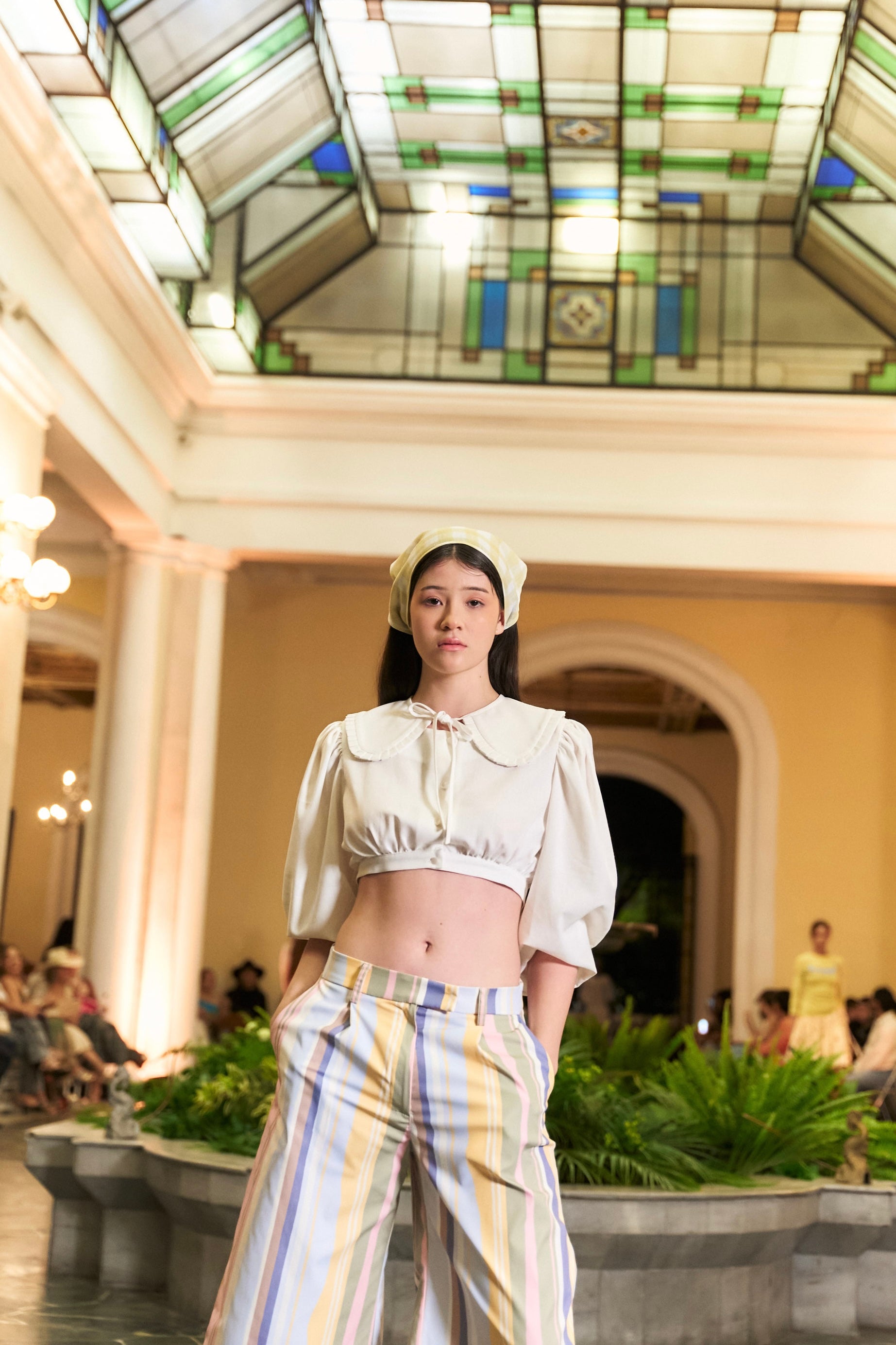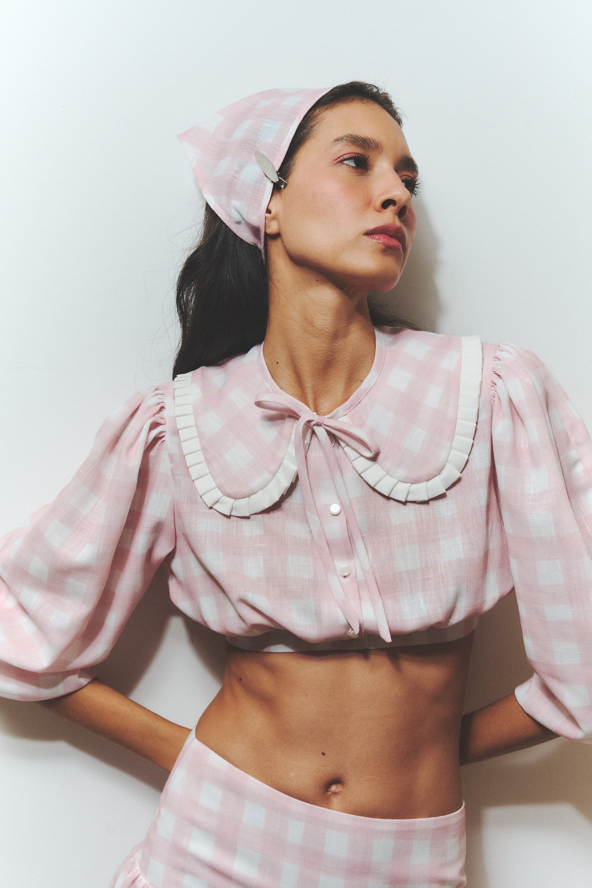 Top corto en lino a cuadros vichy color rosa pastel o ivory. Tiene cuello oversized con detalle ondulado y lazo al frente, mangas abombadas a media manga y silueta romántica. Diseñado y confeccionado en Colombia.