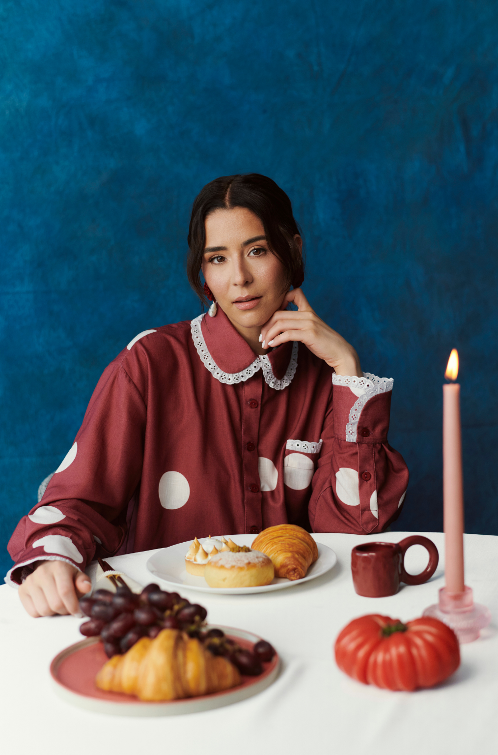 Camisa de fit oversize con cuello camisero y bolsillo frontal. Presenta un ruedo curvado con cruce al centro y ribetes decorativos en cuello, puños y borde inferior. Diseñada y confeccionada en Colombia. Colaboración con María Riba (2025).